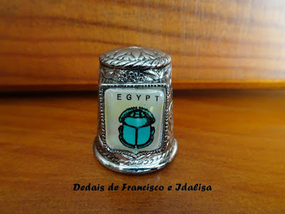 Segundo dedal em metal do Egipto de uma colecção de nove dedais com temas do Antigo Egipto este reproduz um escaravelhoum guia do universo cósmico que ensina sobre os elementos das forças criativas, pois ele, por si só, é o símbolo da eternidade.